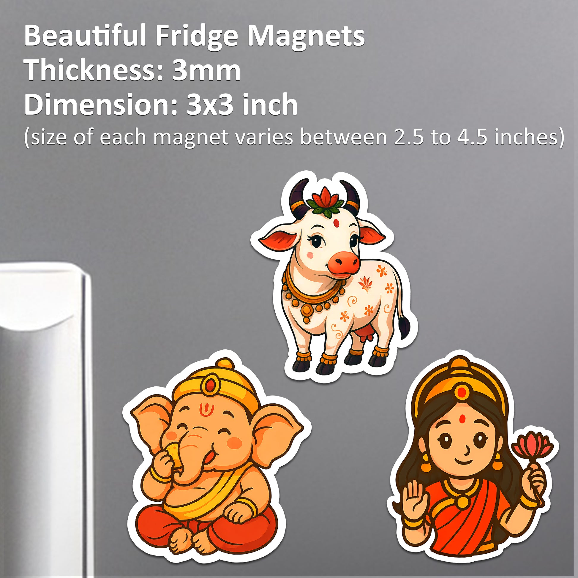 - SET OF 3 GOD MAGNETS– Features adorable cartoon-style designs of Kamadhenu cow, Bal Ganesha, and Goddess Lakshmi, perfect for adding a spiritual yet playful touch to your décor.