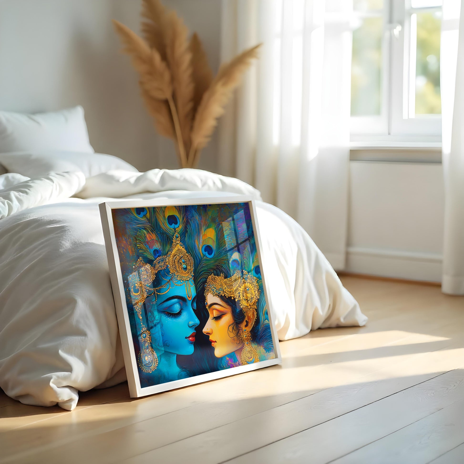 Infuse your modern living space with the timeless love of Radha and Krishna through this striking abstract canvas wall art. This vibrant panel frame offers a contemporary interpretation of the divine couple, featuring rich colors, intricate details inspired by peacock feathers, and a modern artistic style. Perfect for adding a spiritual yet stylish touch to your living room, bedroom, or meditation area. This high-quality canvas print captures the essence of Hindu spirituality with a trendy, abstract flair, making it a unique and inspiring addition to your home decor.