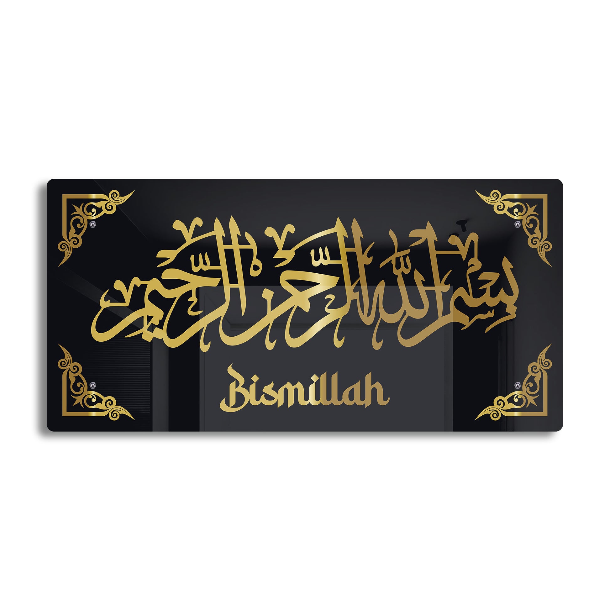 Begin every space with blessings and elegance through this beautifully crafted Bismillah Islamic Wall Art. Featuring the sacred phrase Bismillah-ir-Rahman-ir-Rahim in graceful Arabic calligraphy, this artwork is designed on a glossy black acrylic base with gold laser-cut detailing, creating a luxurious and modern spiritual statement.