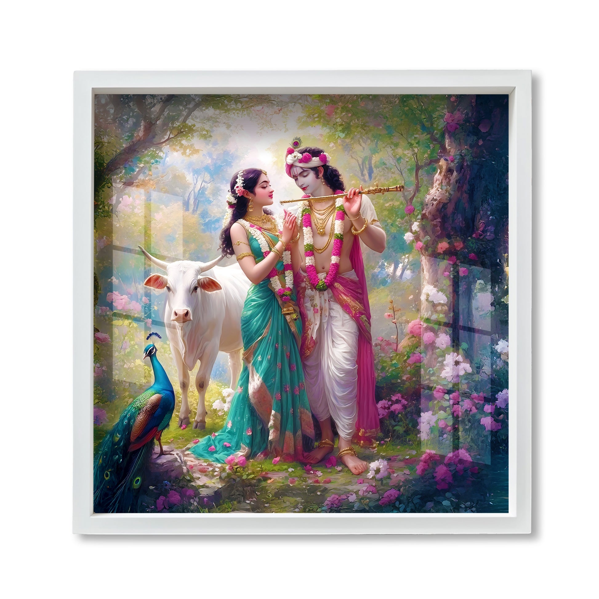 Radha Krishna Vrindavan Wall Art | Spiritual Acrylic Painting with White Frame | Hindu Couple Decor with Cow
